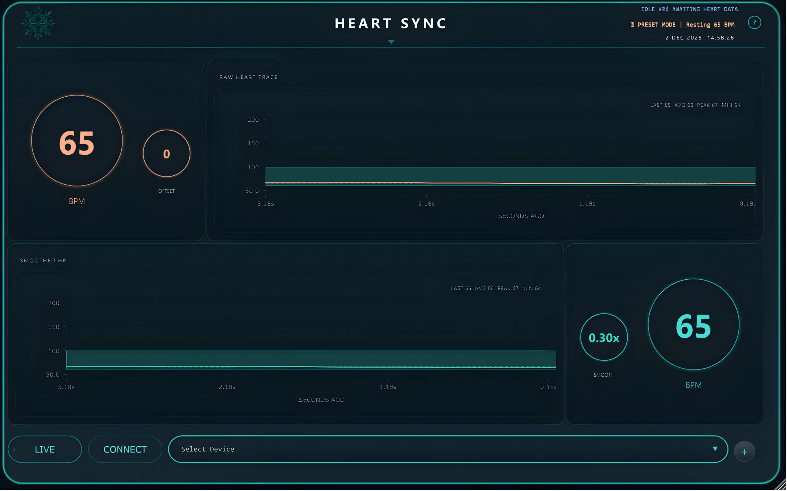The Smooth control sets how quickly HeartSync reacts. Under the hood, it adjusts an exponential moving average across recent beats – rejecting glitches and easing between changes so the tempo moves musically.